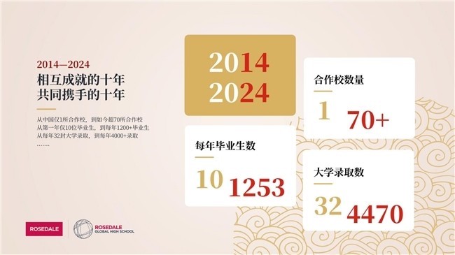 从十年前的中国区仅1所合作校,到如全国超70所合作校;从第一年仅10位学生,到2024届1253位毕业生;从第一届学生的32封大学录取,到近3年毕业生累计获超1万封世界名校录取...十年的发展与收获见证了罗斯德全球高中模式的成功。